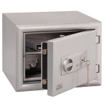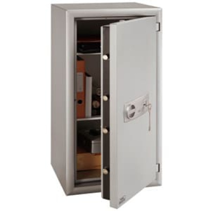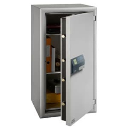 Godkendt af F&P (Sikringsniveau 60). Europæisk godkendelse efter EN 1143-1 i klasse I for tyveri og EN 15569 LFS 60 P for brand. Værdiskab med tredobbeltvægget kabinet og firedobbeltvægget dør med armeret brandisolerings beton. Låsning med kraftige 28mm rundbolte på 4 sider af døren. To nødlåsningssystemer, som blokerer skabet i tilfælde af tvangsåbning. Brugerhistorik kan udlæses via software (tilkøb). Forankringsmulighed i bagvæg og gulv. Plads til liggende A4 ringbind. Justerbar hylde. Fås med nøgle og elektronisk kodelås med fingerscan