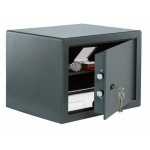 Pengeskabet har en enkeltvægget stålkrop og en dobbeltvægget dør for ekstra sikkerhed. Den er også udstyret med forstærkede låsebolte og borebeskyttelse for at modstå indbrud og tyveri.